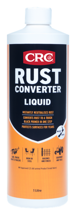 CRC Rust Converter is a unique fast drying coating formulated for treatment of lightly rusted or correctly prepared metal surfaces. CRC Rust Converter neutralises rust and converts it to a tough black primer in one easy step. It binds to the surface and provides a waterproof barrier by sealing out moisture and other outside elements for effective long-lasting rust protection. No more sandblasting, heavy scraping, or grinding.
